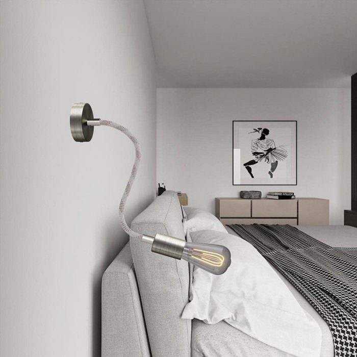 Opletený povrch z jemné Rayon textilie (umělé hedvábí) dodává kovovému husímu krku s robustní mechanikou mimořádný vzhled, díky kterému se stává nejen funkčním, ale i estetickým prvkem interiéru.