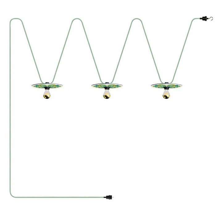 Přenosný venkovní světelný řetěz na žárovky s připojením do zásuvky Lumet Maioliche IP44 je vyroben z termoplastových komponent. Přibalený venkovní textilní kabel je možné v případě potřeby upravit na požadovanou délku. Originalitu a hravost mu propůjčuje také stínidlo Maioliche s ø 24cm.