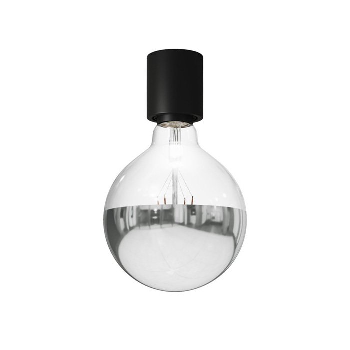 Toto svítidlo s aplikací a stříbrnou půlkulovou žárovkou obsahuje válcovou objímku, která je k dispozici v černém a bílém provedení, a žárovku z čirého skla se stříbrnou povrchovou úpravou kopule, která působí jedinečným vizuálním dojmem.