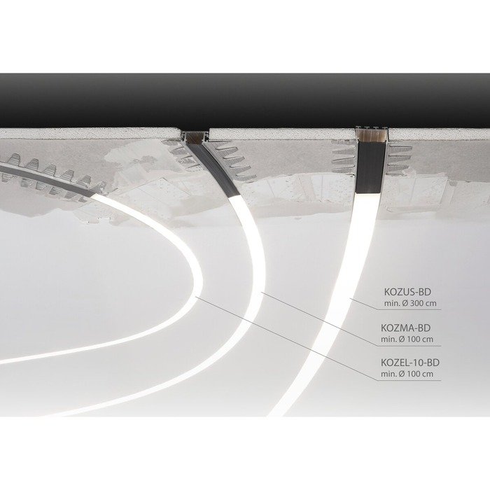 Ohybatelný vestavný LED profil k zabudování do sádrokartonu KOZUS-BD je určen pro malosériovou výrobu a profesionální realizaci osvětlení v podhledu nebo stěnách ze sádrokartonu. Flexibilní konstrukce profilu z vysoce kvalitní hliníkové slitiny je optimalizována pro paralelní instalaci dvou LED pásků, čímž umožňuje dosažení vysokého světelného výkonu a rovnoměrného rozložení světelného toku v rozsáhlejších instalacích. Flexibilní LED profil do sádrokartonu umožňuje realizaci čistých, bezrámečkových světelných linií. Možnost individuálního ohýbání navíc poskytuje možnost realizace kruhových nebo obloukových tvarů dle individuálních architektonických návrhů. Díky preciznímu technickému zpracování v kombinaci s celosvětově uznávanou produktovou kvalitou značky KLUŚ zaručuje špičkové světelné vlastnosti, vysokou účinnost a dlouhou životnost osvětlovacího systému.