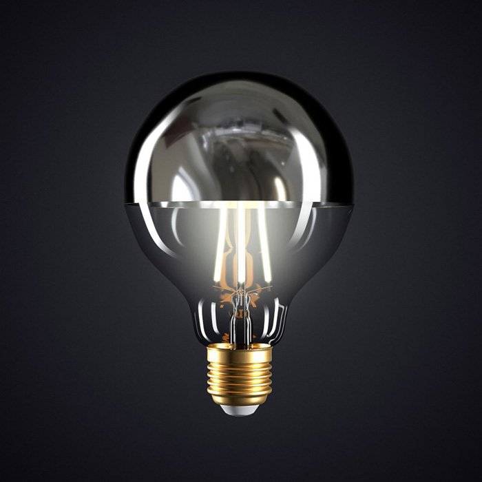 Stmívatelná žárovka se zrcadlovým vrchlíkem E27 závitu s produktovým označením Dome Silver o příkonu 7W je dekorativní a energeticky efektivní světelný zdroj. Vzhledem k oblíbenému tvaru skleněné baňky G95 (Globe - v nejširší části Ø 95mm) je skvělou alternativou do všech závěsných svítidel s objímkou E27. To co dělá žárovku Dome Silver mimořádným prvkem světlené dekorace je stříbrný zrcadlový vrchlík. Zastíněný vrchol žárovky způsobuje, že produkované světlo proniká do prostoru pouze skrze čirý skleněný obvod žárovky. Stmívací zrcadlová žárovka G95 s nesměrovým vyzařováním světla slouží pro neoslňující světlené efekty a osvětlení charakteristiky: