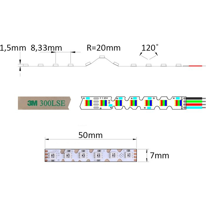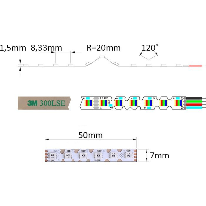 - ≈5cm dělitelnost jednotlivých modulů - krácení RGB ZIG-ZAG pásku RGB24120E je možné pomocí technických nůžek pouze na vyznačeném místě.