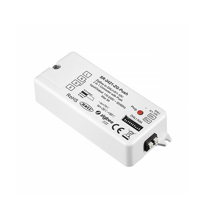 Převodník ZigBee DALI nebo 0/1-10V s funkcí PUSH-DIM a označením SR-2421-ZG-PUSH je špičkové elektronické zařízení pro ovládání svítidel. Hlavní předností je univerzální kompatibilita se ZigBee Hub/Gateway od různých výrobců, což umožňuje snadnou integraci do Smart Home systémů a ovládání DALI nebo 0/1-10V svítidel. Nadstavbu v podobě řízení osvětlení představuje také možnost připojení tlačítkového vypínače pomocí sběrnice PUSH-DIM. Převodník SR-2421-ZG-PUSH podporuje ZigBee 3.0 protokol a vyniká spolehlivostí a prvotřídní kvalitou zpracování, za kterým stojí renomovaná značka Lux Miners by Sunricher.